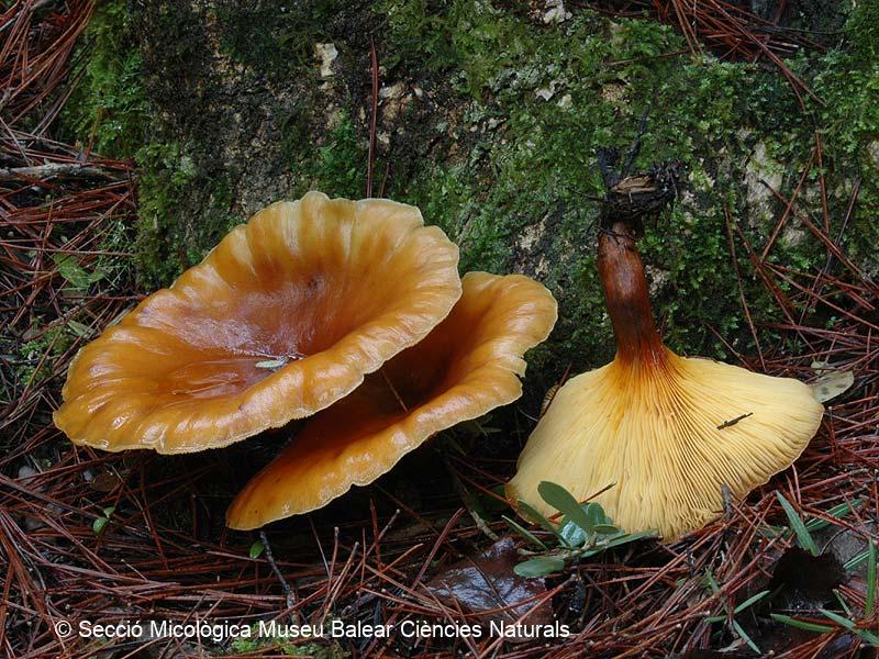 Capell : De 10 a 15 cm. de diàmetre, al principi convex i es va obrint fins a ser quasi pla o inclús infundibuliforme, amb el marge prim i enrotllat cap a l'interior, de color taronja groguenc a un groguenc safrà amb algunes tonalitats més o manco rogenques.