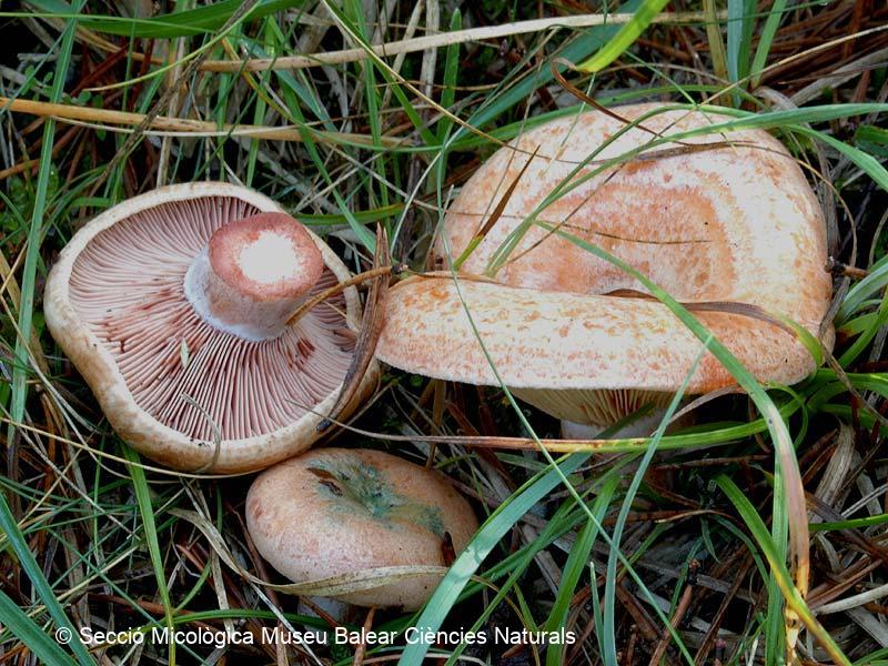 Descripció : L'esclata-sang Lactarius sanguifluus (Paulet) Fr., fong de la família dels russulals, és un dels més populars, apreciats, cercats i consumits arreu dels Països Catalans. Creix a zona de pinar ja que guarda una estreta relació amb el pi blanc (Pinus halepensis) amb el que forma micorrizes, que són associacions simbiòntiques que es formen entre el fong i les arrels de l'arbre, amb la finalitat d'afavorir el desenvolupament d'ambdues espècies. El esporòfor d'aquest fong es veu sovint atacat per Hypomyces lateritius (Fr.) Tul, un fong paràsit que li provoca la deformació de les làmines i una consistència més compacta de la carn. L'esclata-sang parasitat no deixa de ser comestible i es coneix a Mallorca com a 'esclata-sang de tot l'any' o 'esclata-sang hivernenc'.