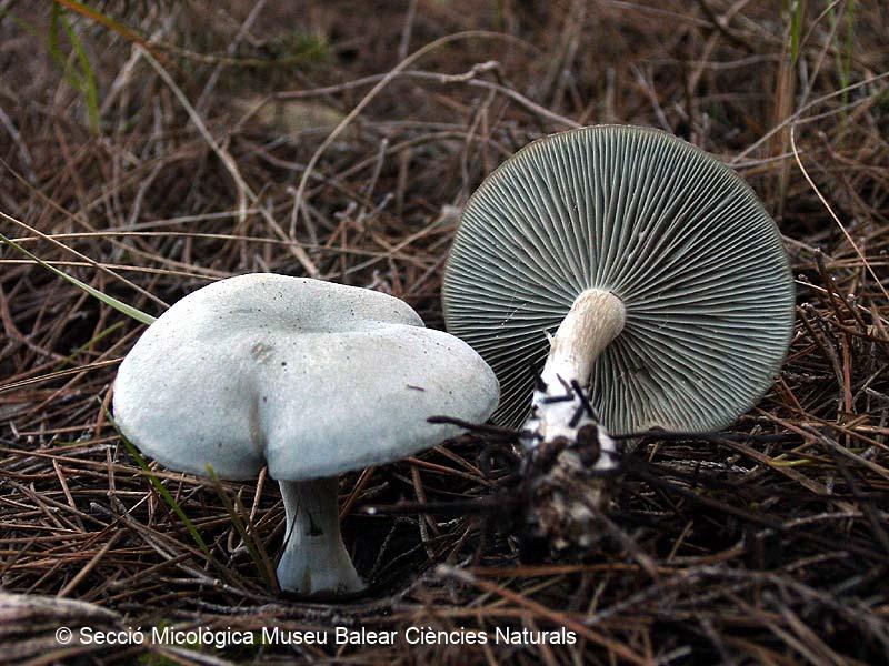 Capell : de 4 a 8 cm. de diàmetre, al principi convex amb els marges incurvats i, amb el temps, més pla i estès i algunes vegades amb els marges aixecats i ondulats; amb la cutícula llisa, de color blau grisós a blau verdós.