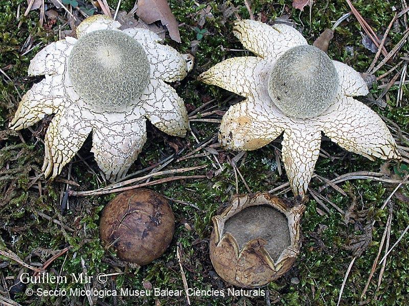 Descripció : Aquest bolet és fàcil de reconèixer per esser higroscòpic, l´exoperidi quan s'humiteja s'obre en forma d'estrella, deixant lliure l´endoperidi que quan es frega un poc o al caure-li a sobre una gota d'aigua provoca que surtin del seu interior petits 'niguls' carregats d´espores mitjançant un porus a l’àpex. En temps sec l´exoperidi es tanca.