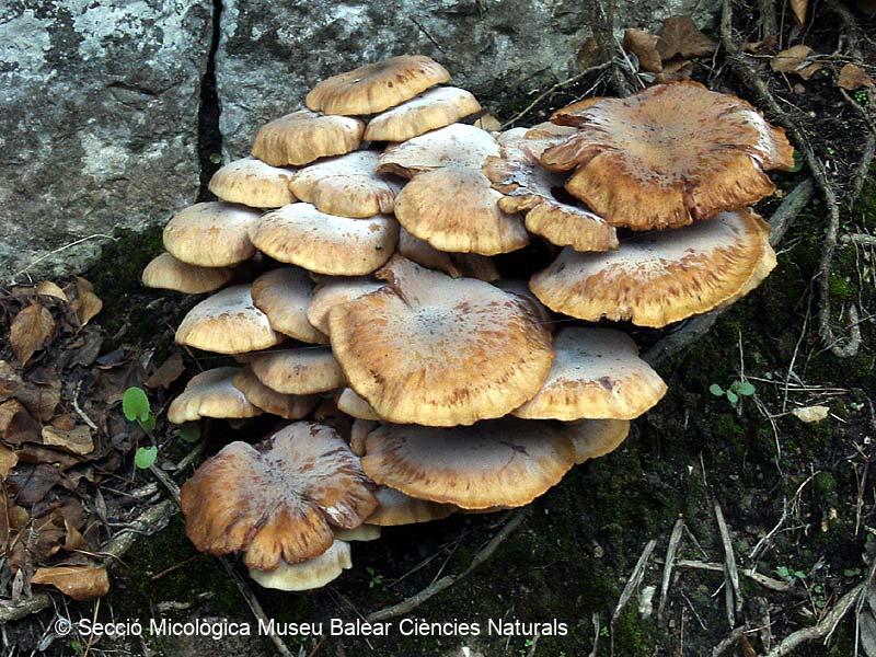 Descripción : Armillaria mellea es un hongo muy frecuente en Mallorca. Típicamente crece en grupos de numerosos individuos sobre troncos de encinas, aunque se puede desarrollar en muchos tipos de árboles diferentes. El hecho de que crezcan en grupos hace que muchas veces los sombreros estén 'manchados' por la caída de las esporas de las setas que están encima. Los ejemplares más jóvenes presentan el sombrero cerrado y todo el conjunto parece un clavo, de aquí el nombre popular de esta seta en italiano: Ciodini (Clavo pequeño). Se puede comportar como un parásito muy perjudicial y provocar problemas graves en explotaciones forestales. M. Rolland, en el año 1903, describió una plaga en los naranjos del Valle de Sóller (Mallorca) que afectó de una manera muy negativa la economía de la comarca.