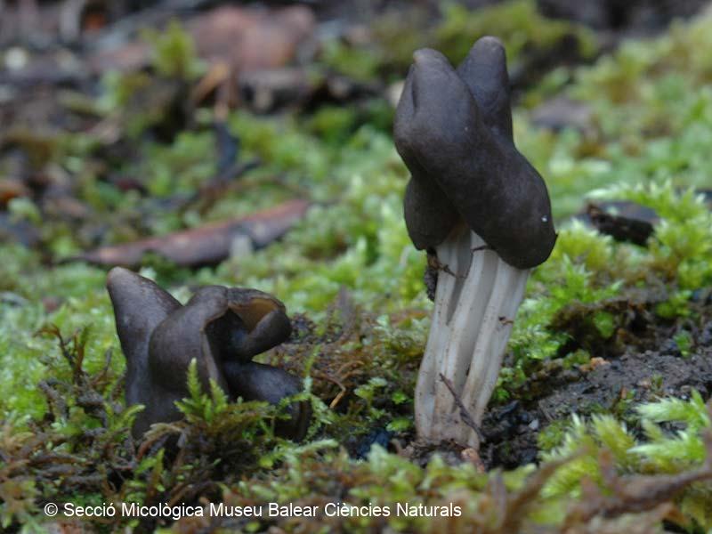 Cuerpo fructífero : especie pequeña, bi o trilobulada, de unos 10 cm. de altura, con forma de silla de montar y de color negruzco.